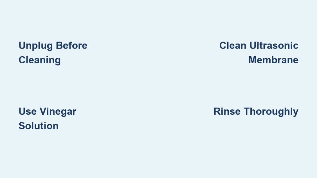 Unplug immediately before touching any component—never clean while plugged in or powered on. Electrical shock risk is real, and residual power can damage the ultrasonic membrane. Wait 2 full minutes after unplugging to ensure all internal capacitors discharge.