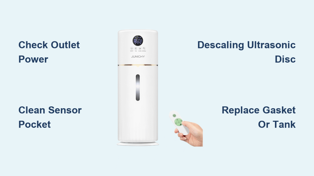 Your Junichy humidifier sat perfectly on the nightstand—until this morning when it refused to mist, blinked red like a warning light, or simply stayed dark no matter how many times you pressed the power button. You’re not alone. These symptoms appear in nearly every Junichy and ElectriQ CD2OLE-V4 console within the first 12-18 months, but most issues fix in minutes without a screwdriver. If your Junichy humidifier not working situation has you scrambling for dry-air relief, this guide delivers the exact steps technicians use—ordered by failure frequency and stripped to actionable essentials. You’ll diagnose the red-flash error, revive dead units, and stop leaks using household items before considering part replacements.