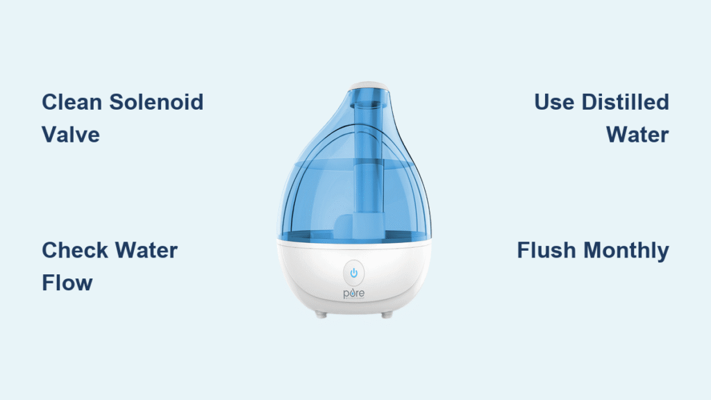 Listen closely when activating your humidifier: Does the motor emit a strained whining sound that abruptly stops after 2-3 seconds? This distinct startup failure—where the unit attempts operation but never achieves steady ultrasonic vibration—differentiates solenoid valve blockages from simple electrical faults. If your humidifier powers on with indicator lights but the motor stalls before reaching full speed, water flow restriction is almost certainly the culprit. Note that this differs from complete electrical failure where no lights illuminate.