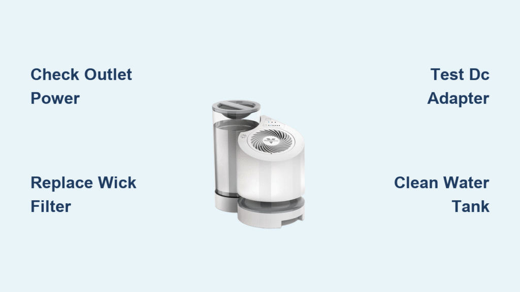 Your evaporative model’s wick filter is the most common culprit when your Vornado humidifier not working produces no mist despite running. Remove the wick and check for: